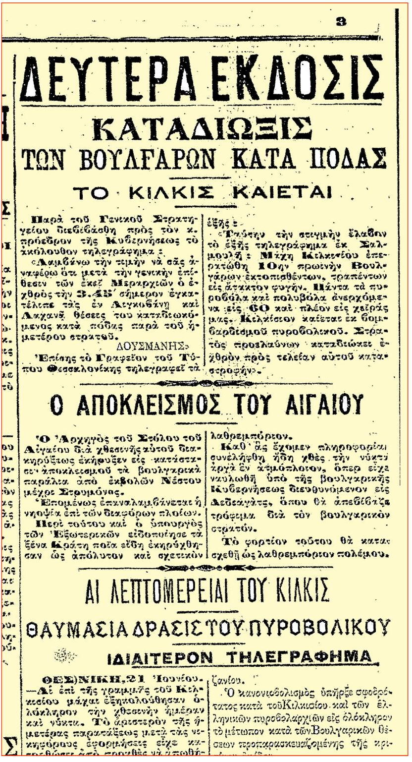 Περί ώραν δεκάτην και ημίσειαν κατελήφθη το Κιλκίσιον, υψωθείσης της Ελληνικής σημαίας εις το υπερκείμενον ύψωμα του Αγίου Γεωργίου.’